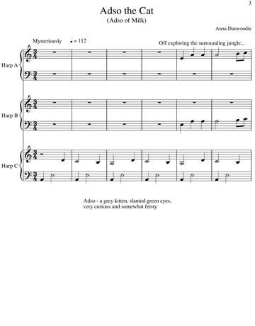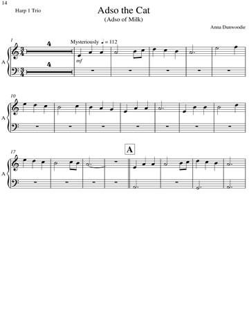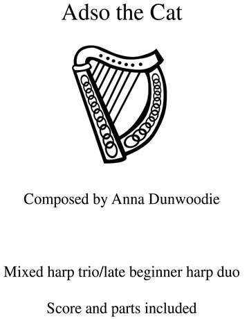 Adso the Cat is a fun piece Anna wrote (as much to amuse herself as anything) as a piece of programme music and both the harpists and the audience love it. And each time the audience is drawn into the adventures of this little kitten. Its really easy – late beginner level, but has changes of mood and time signature as Adso goes through his day. Its in the key of C with one lever change for the second harp part. Anna originally arranged it for the orchestra as a mixed harp trio, and she also arranged it since for early intermediate harp duo.
