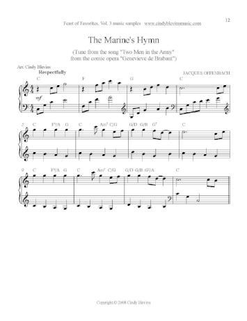Patriotic Songs and Hymns: "Onward Christian Soldiers," "America, the Beautiful," "My Country, 'Tis of Thee," "The Caissons Go Rolling Along," "The Marine's Hymn," "The Star-Spangled Banner" and "Battle Hymn of the Republic."