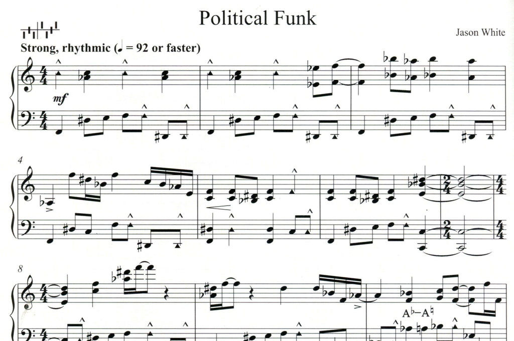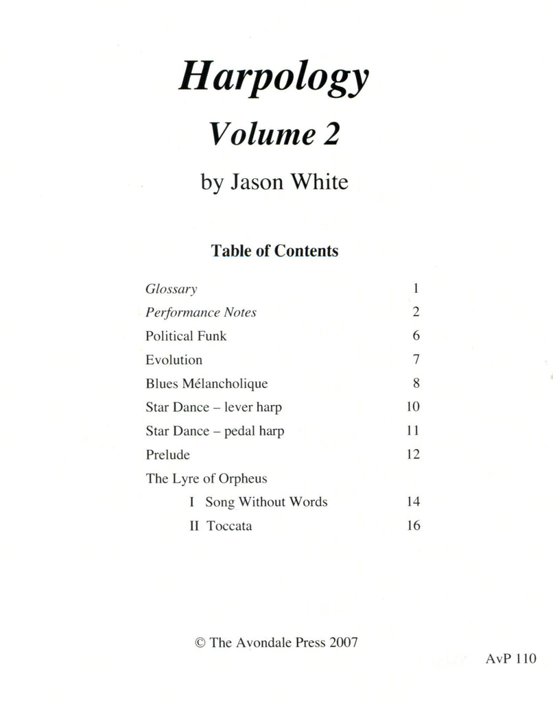 A collection of solos including performance notes. Jason White intended these pieces for pedal harp but most could also be played on lever harp. Contents: Political Funk, Evolution, Blues Mélancholique, Star Dance, Prelude,The Lyre of Orpheus. Listed in the Royal Conservatory harp syllabus.