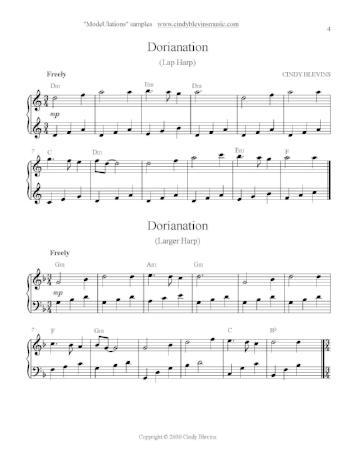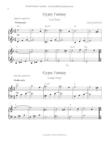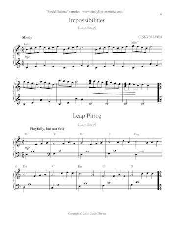 Song titles are: Absence, Aoleo, Dominoes, Dorianation, Gypsy Fantasy, Impossibilities, Leap Phrog, Mind Over Minor and Minor Malady. Many of the songs are done both for regular harp and lap harp in this book (which is why there are 16 solos in the book and only 9 song titles.