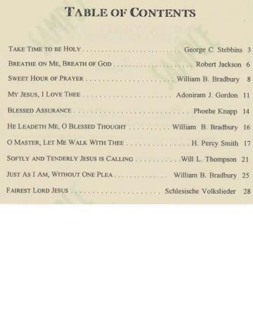 Take Time to be Holy, Breathe on Me Breath of God, Sweet Hour of Prayer, My Jesus I Love Thee, Blessed Assurance, He Leadeth Me O Blessed Thought, O Master Let Me Walk With Thee, Softly and Tenderly Jesus is Calling, Just As I Am Without One Plea, Fairest Lord Jesus.