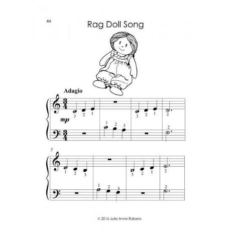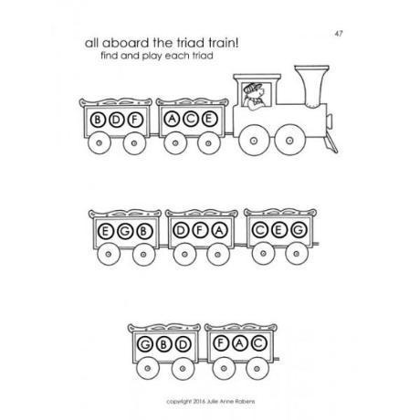 Book 2 gradually takes away note names in noteheads on repeated notes, note recently played, and when reading patterns. Note are played one at a time in each hand, and all four fingers are introduced. Students also learn about major and minor triads, inversions, and major and minor scales!