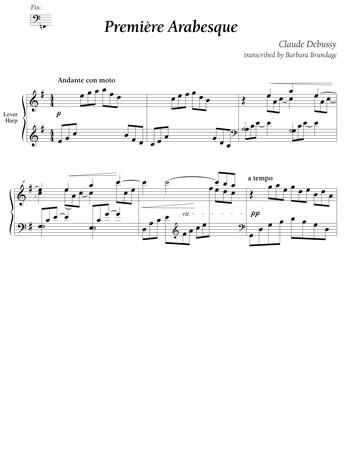 A lever harp transcription of the lyrical and flowing First Arabesque, originally written for piano. Key of G, lever changes are clearly marked, harmonies and original melody are not compromised. The three-against-two rhythm of the main sections are challenging for any musician, but so satisfying to the listener. ADVANCED, ALL HARPS.