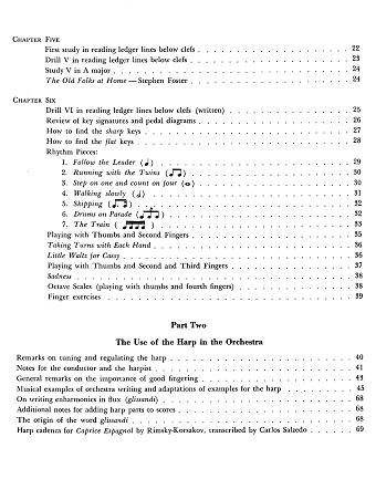 This helpful book can be thought of as a reference book for teachers and pedal harpists, though it mainly consists of material for the beginning harpsist. Exercises and drills are used in conjuction with the written material, and then the new elements are incorporated into tunes all throughout the book, enabling the student to show off their new skills. Emphasis is placed on learning to read music, highlighting the importance of reading of notes above and below the staff, which is often overlooked. There is a section on the use of the harp in an orchestra, transcribing orchestral music for harp, notes for the conductor on what they can expect from their harpist, and many more items which are subtle, but are also the mark of excellent musicianship.