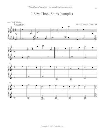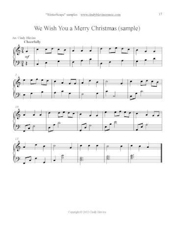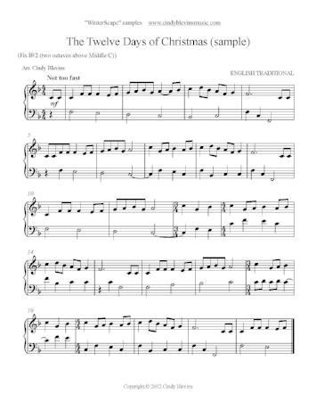 The book includes "The Twelve Days of Christmas (five pages)," "Away In A Manger," "Carol Of The Bells," "The Son of Mary," "Good King Wenceslas," "Hark! The Herald Angels Sing," "Here We Come A-Wassailing," "In Dulci Jubilo," "I Saw Three Ships," "Joy To the World," "Lo, How a Rose E'er Blooming," "O Little Town of Bethlehem," "Pat-a-Pan," "Sussex Carol," "We Wish You a Merry Christmas," and "WinterScape." "WinterScape" is an eight-page medley of seasonal tunes not included in the book, interspersed with original music.