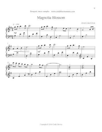 Bouquet contains 20 pages of beautiful original solos for lever or pedal harp, in the approximate range of "intermediate." There are 10 songs in the book.