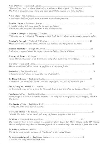 Table of Contents: Adio Querida, Adon Olam Árvoles Lloran, Carolan's Draught, Carolan's Farewell, Eleanor Plunkett, Evening of Roses, Garfalia, Jerusalem, La Rosa Enflorece, On the Way to Cesarea, The Banks of the Suir, Scarborough Fair, The Lilac Flower, Ya Ribon, Yo m'enamori d'un aire.
