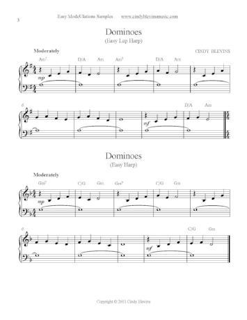 Song titles are: Absence, Aoleo, Dominoes, Dorianation, Gypsy Fantasy, Impossibilities, Leap Phrog, Mind Over Minor and Minor Malady. Many of the songs are done both for regular harp and lap harp in this book (which is why there are 16 solos in the book and only 9 song titles.